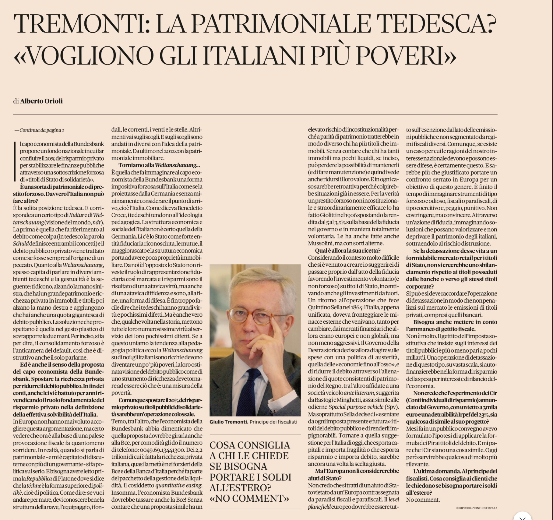 Tremonti: la patrimoniale tedesca? “Vogliono gli italiani più poveri”