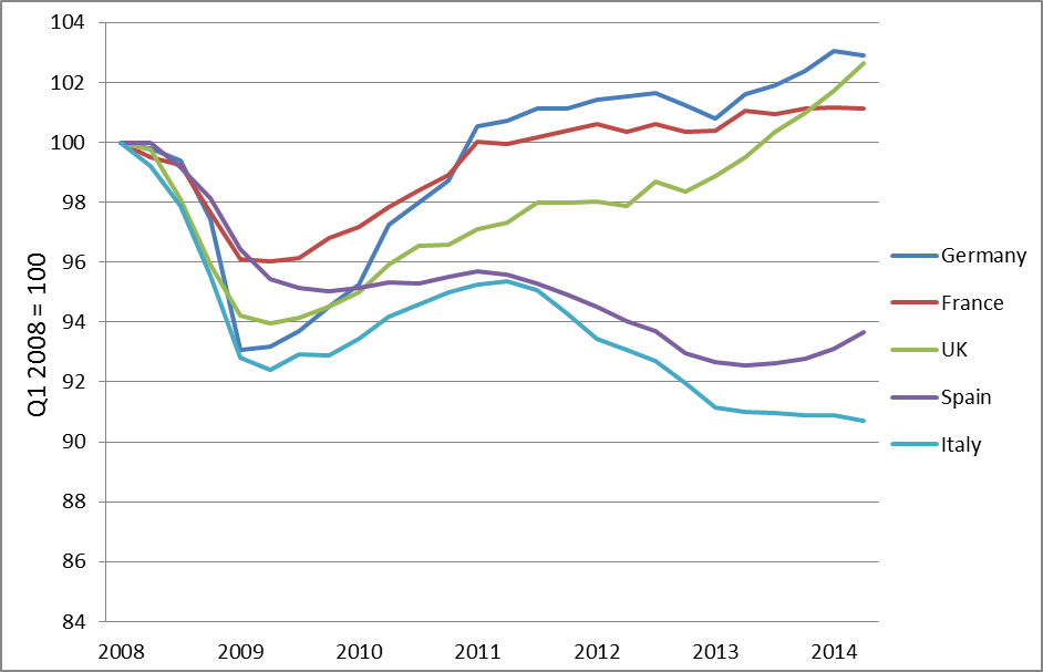 This deference to Germany is puzzling. While it is the largest economy in the eurozone, it is hardly dominant, accounting in 2013 for 29 per cent of eurozone GDP as opposed to France’s 21 per cent, Italy’s 16 per cent and Spain’s 11 per cent. Economic growth in Germany has certainly rebounded faster since the crisis than in other eurozone countries. But the German recovery now seems to have run its course, with exports to both European and non-European markets under pressure and domestic demand being held back by weak levels of public and private investment (see chart 1). Even the German government expects growth of just 1.3 per cent 2014 and 1.2 per cent in 2015.