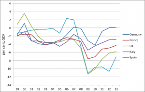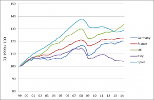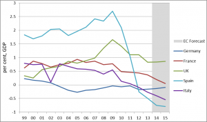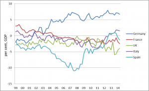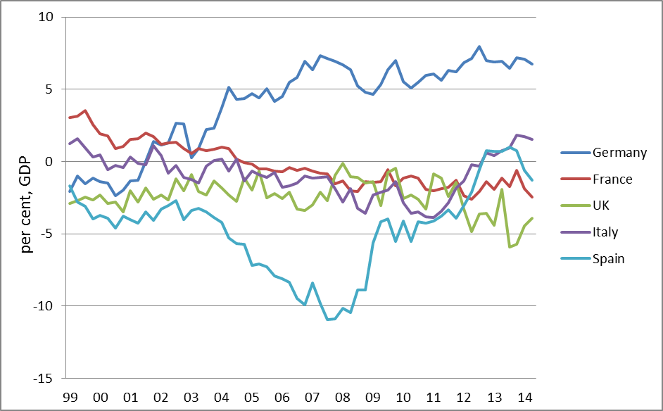 There have been some tentative signs of rebalancing over the last 12 months – with growth in domestic demand outpacing overall economic growth. But Germany remains chronically export-dependent – its current account surplus is on course to exceed 7 per cent of GDP in 2014 for the second successive year. The country is certainly not the ‘locomotive’ of the eurozone economy, as some journalists like to call it, but a drag on it. Some German policy-makers argue that stronger domestic demand in Germany would have little impact on other eurozone economies, but they are being rather disingenuous. The government has attributed the economy’s loss of momentum over the course of 2014 to weak eurozone demand, so cannot simultaneously deny that what happens in Germany has no impact on other eurozone economies. With Germany accounting for almost 30 per cent of the eurozone economy, what happens to aggregate demand in Germany clearly has a major impact on the level of demand across the eurozone as a whole.