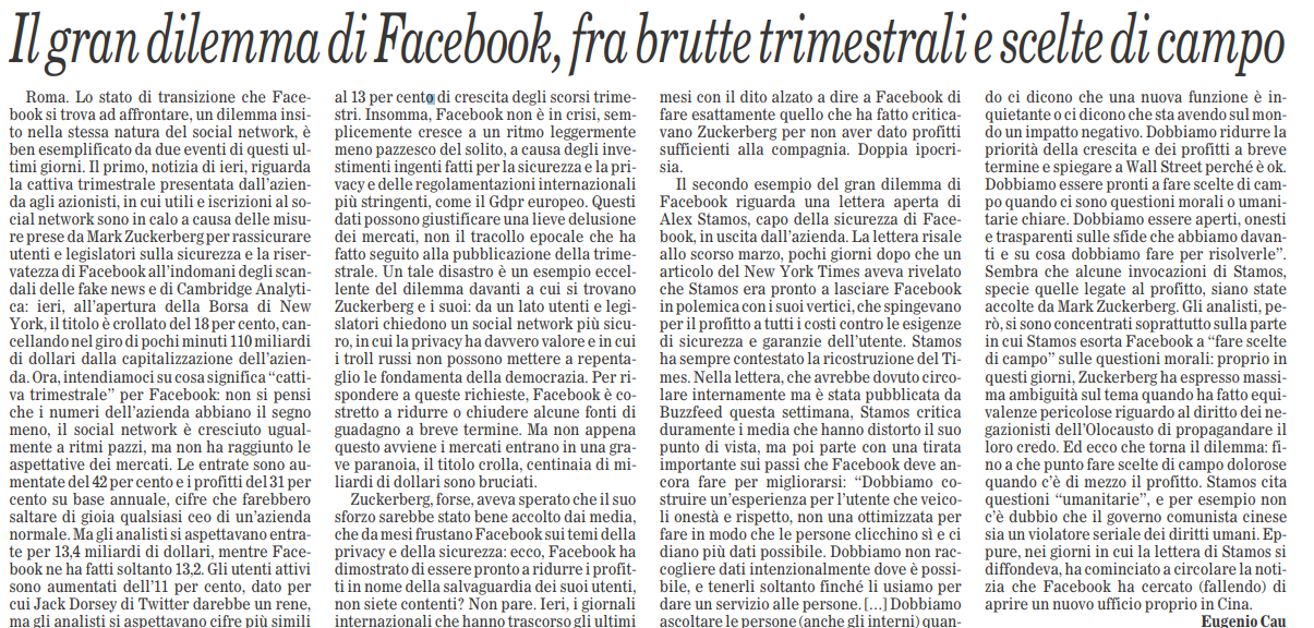 Ci saranno di certo quelli che vi avranno la “giusta punizione” per il comportamento incauto (o doloso) con cui Facebook si appropria dei nostri dati e li vende a chi ne approfitta per farci comprare cose di cui non abbiamo bisogno e farci esprimere valutazioni politiche che mai avremmo liberamente prese. Ma si dovranno rassegnare: dopo il tonfo di giovedì, la quotazione di Facebook ha recuperato tutta la perdita seguente allo “scandalo” di Cambridge Analytica, ed è più alta dell’85,% degli ultimi 12 mesi.