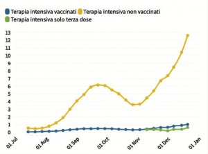Eppure, caro Franco, occorre essere onesti e dire che una volta che il super mega ultra Green pass verrà esteso anche per i posti di lavoro di fatto l’obbligo vaccinale sarà entrato in vigore. Si possono avere molti dubbi su questo tema, e confesso che sull’obbligo qualche dubbio ce l’ho, anche se ieri il nostro Carnevale Maffè è stato molto convincente, ma non si può avere invece alcun dubbio su un fatto che mi pare ormai evidente. Nel mondo, esistono due pandemie. Una riguarda i vaccinati, che se contagiati dopo la terza dose affrontano il Covid-19 come se fosse un’influenza, e un’altra riguarda i non vaccinati. E per mettere a fuoco queste due pandemie può essere utile farvi vedere un grafico. Sull’obbligo vaccinale, si può discutere. Sull’obbligo di non dire stupidaggini, non ci dovrebbe essere più molto da discutere. Grazie.