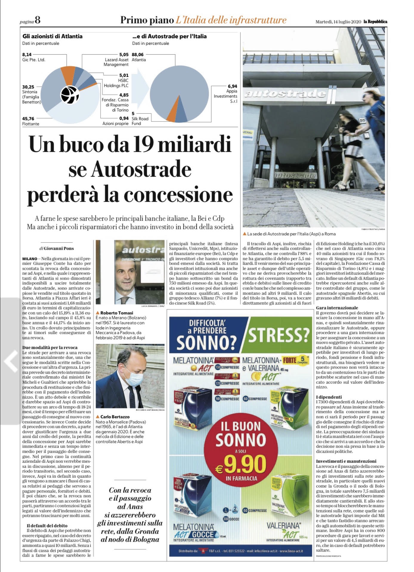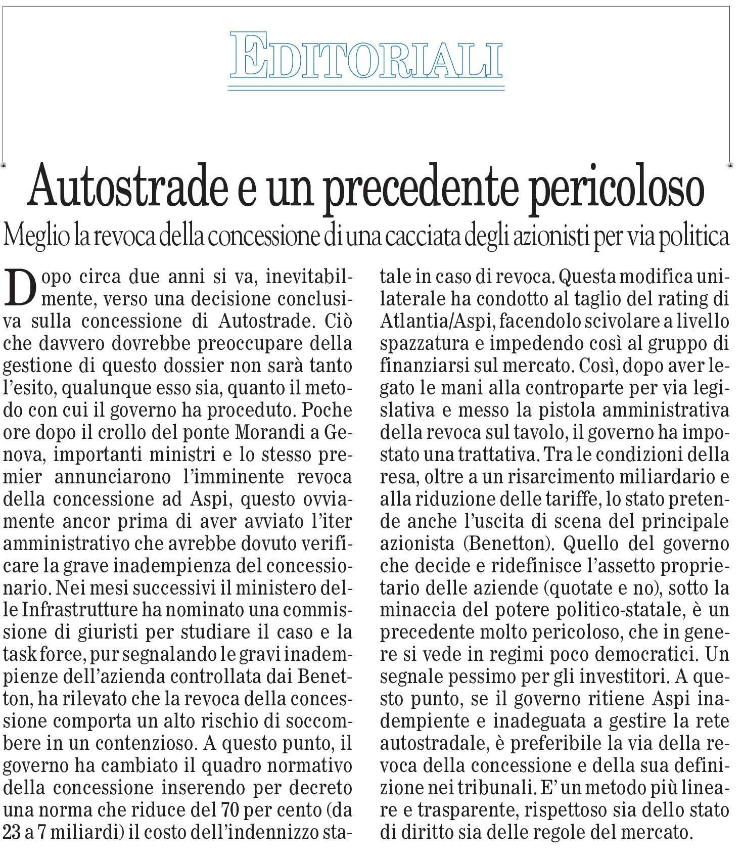 La Costituzione prevede l’esproprio a fini di utilità generale salvo indennizzo, un obbligo che vale siano ASPI o Atlantia il bene espropriato. (Valeva anche per l’ILVA dei Riva, e non ha portato molto bene). E lo Stato non può essere colui che espropria e fissa l’entità dell’indennizzo, quello avviene in altri ambienti: per intenderci, in un webinar di ieri, a cui partecipavano illustri accademici e personaggi politici di primo piano, è stato evocato il nome di Messina Denaro.