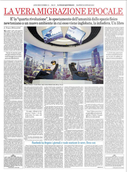 Non inganni il titolo. Nella sterminata letteratura sulla società digitale, “The 4th Revolution” è un libro diverso, fin da quel 4 nel titolo che sembra fare il verso a tutti i 3 e 4 che ricorrono nelle periodizzazioni storiche. Diverso perché diversa è la storia, perché a scriverla non è uno scienziato o un tecnologo, un micro- o un macroeconomista, un finanziere o un sociologo, un politico o uno scrittore di fantascienza, ma un filosofo. E al filosofo quello che interessa è l’uomo, e quello che l’uomo pensa, di se stesso e del mondo in cui vive.